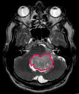 MRI toont meestal een enorme contrastverhogende laesie waarbij het cerebellum betrokken is. Zoals hierboven vermeld, heeft medulloblastoom een hoge neiging om lokaal de leptomeningen te infiltreren en zich ook door de subarachnoïdale ruimte te verspreiden, waarbij de ventrikels, cerebrale convexiteit en leptomeningeale oppervlakken van de wervelkolom betrokken zijn. Daarom is het noodzakelijk om de gehele craniospinale as in resonantie te brengen.