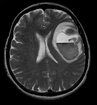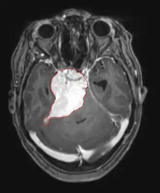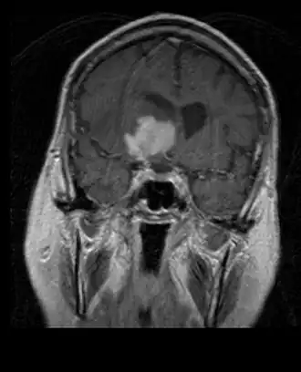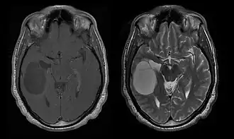 Aan -MRI toont een intracraniële tumor als een massieve laesie die na gebruik van het contrastmiddel meer luminescent kan worden. Er is echter altijd een signaalafwijking in -Magnetic resonance imaging, die de aanwezigheid van neoplasie of vasogeen oedeem aangeeft. Gewoonlijk is verhoogde luminescentie (contrastversterking) indicatief voor een tumor met een hogere graad van maligniteit. Kenmerkend voor glioblastoom is een contrastring, waarbij het lichtgevende deel overeenkomt met het vitale deel van de kwaadaardige tumor en het donkerdere -hypointens gebied dat overeenkomt met weefselnecrose.