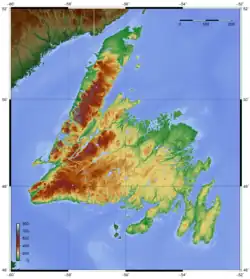 Newfoundland wordt in het westen gekenmerkt door de Long Range, een bergketen die van zuid naar noord loopt en die een uitloper van de Appalachen is. In het uiterste zuidwesten liggen de Anguille Mountains, een nevengebergte van de Long Range waar zich onder andere de Codroyvallei bevindt. De Exploits is met 272 km de langste rivier van het eiland.