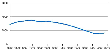 Onderstaande figuur toont het verloop van het inwoneraantal vanaf 1880.[1]