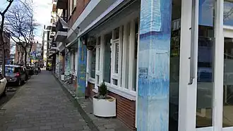 - wallprints van kunstwerk uit de collectie van de kunstuitleen, verspreid over zeven pilaren, onderdeel van de dragende constructie van woon/winkels nabij de Kinkerstraat