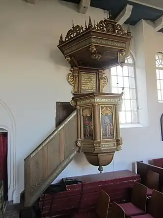 Pronkstuk van de kerk is een preekstoel uit de late renaissance. Het klankbord draagt het wapen van gravin Sofia, die in Pewsum stierf († 1630). De eikenhouten preekstoel werd in 1937 in de oude staat terug gebracht door een witte laklaag te verwijderen en het aanbrengen van groengrijze en roodbruine kleuren met vergulde accenten. De kansel en trap zijn versierd met meerdere bijbelteksten en in de velden van de kanselkuip bevinden zich de geschilderde panelen van de vier evangelisten.