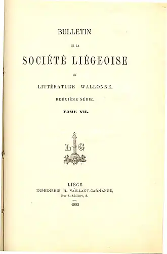 - ↑ (fr) Lequarré, Nicolas, Li manôye å vî Payi d' Lîdje - Un texte scientifique en wallon en 1907. Bulletin du Dictionnaire général de la langue wallonne, Tome IIème. Société Liégeoise de Littérature wallonne (1907).