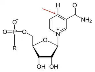 - ↑ Ter verduidelijking: beschouw de nicotinamide-ring als liggende in het vlak van een bladzijde. Een klasse A-enzym draagt het waterstofion over van "voren" (boven de bladzijde); klasse B van "achteren" (onder de bladzijde).[41]