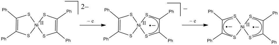 De (spectroscopisch) experimentele gegevens wijzen echter uit dat de elektronensituatie rond nikkel niet echt wijzigt. Het stilbeendithiolaat gedraagt zich als een redox niet-innocente ligand. De oxidatie vindt vooral plaats in de ligand, en niet op het metaal. Hierbij ontstaan ligand-radicaalcomplexen. Het neutrale complex, in figuur 1 de meest rechtse structuur, vertoont eigenschappen van een singlet diradicaal,[4] waardoor dit beter beschreven wordt als een complex van met het radicaal anion . Het diamagnetisme van het complex wordt toegeschreven aan de interactie tussen de twee ongepaarde elektronen in de liganden.
