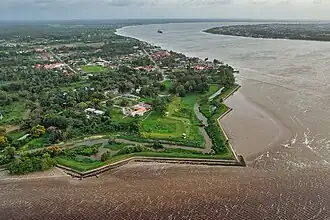 De samenvloeiing van de rivieren Suriname en Commewijne bij Nieuw-Amsterdam.