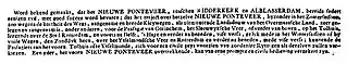- ↑ Word bekendgemaakt, dat het NIEUWE PONTEVEER, tuschen RIDDERKERK en ALBLASSERDAM, bereids sedert eengen tyd, met goed succes word bevaren; dat het traject over hetzelve NIEUWE PONTEVEER, byzonder in het Zomerlsaisoen, zoo wegend de kortheit des Wegs, aangename en breede Kleywegen, als uitmuntende Landsdouw van het Overmaasfche Land , zeer gelegen en aangenaam is. Onder anderen, voor de Passagie van Goirinchem, het Sleewyksche Veer , of verder van boven , op het Tolhuis, leggende over de Stad Rotterdam, en voorts na Delft, 's Hage en verder na bereden, vice versa, gelijk mede in het Wintersaisoen of by vuile Wegen, den Zanddvk heen, over bet Ysselnmondesche Veer na Rotterdam en verder na beneden, mede vifc verfa; kunnende de Passagiers aan het voorn. Tolhuis of te Ysselmonde, zich voor een civile prys voorzien van zoodanige Rytuigen als dezelve zullen verkiezen Een yder het voorn NIEUWE PONTEVEER overtrekkende kan van eene prompte en civile bediening verzekert zyn.