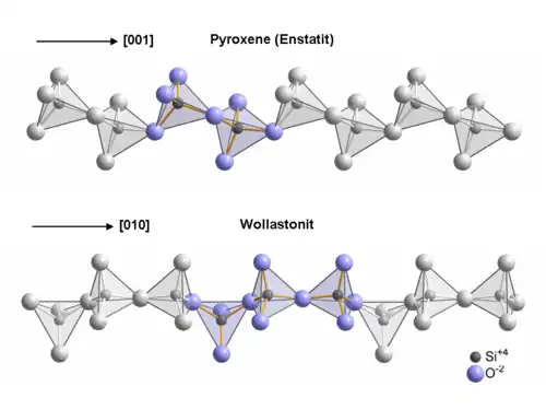 - Als n = 1 zijn de tussen accolades beschreven elementen slechts met één atoom met elkaar verbonden. Voorbeelden zijn de inosilicaten (pyroxenen) waarin silicaat-tetraëders aan de hoeken met elkaar verbonden zijn tot langgerekte ketens, eendimensionale structuren.