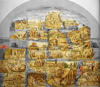 Op basis van de Dal Pozzo-aquarellen nummerde Helen Whitehouse de 20 originele segmenten, te beginnen met de bovenste delen 1a, 1b (die oorspronkelijk één geheel vormden) en 2 t/m 19. Daarnaast werden met de nummers 20 en 21 twee kleine secties door Paul Meyboom als origineel geïdentificeerd. Alle figuratieve scènes van het mozaïek zijn gekopieerd op de Dal Pozzo-aquarellen, behalve die van de kleine secties 20 en 21. Alle figuratieve scènes zijn in kleine en onregelmatige mozaïeksteentjes uitgevoerd, terwijl de niet-originele verbindingsstukken veelal uit vierkante, wat grotere stukjes bestaan. Op deze 17e-eeuwse verbindingsstukken is voornamelijk water en rotsen te zien.