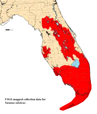 Als exoot komt de nijlvaraan voor in de Amerikaanse staat Florida. De varaan is hier niet op eigen kracht terechtgekomen, alle populaties bestaan uit ontsnapte of uitgezette huisdieren.[6] Ook zijn wel andere soorten varanen waargenomen, maar van deze soorten is niet bekend dat ze zich kunnen handhaven. De nijlvaraan kent stabiele populaties rond grote delen van het zuiden van Florida en verplaatst zich naar het noorden. De varaan kan zich ook verspreiden naar omliggende eilandjes.[7]