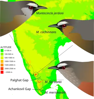 Deze soort is endemisch in India en telt 2 ondersoorten, M. c. jerdoni en M. c. cachinnans die in geografisch gescheiden populaties leven in het zuidelijk deel van de West-Ghats in de deelstaat Kerala (zuidwestelijk India). Het leefgebied is montaan bos en struikgewas boven de 1200 m boven de zeespiegel. De vogel nestelt in dicht struikgewas in vochtige en schaduwrijke plekken op berghellingen. Veel minder wordt de vogel waargenomen in aangeplant bos.[1]