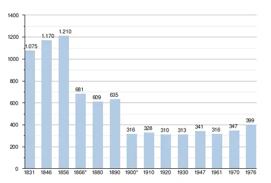 - Bronnen:NIS, Opm:1831 tot en met 1970=volkstellingen, 1976= inowneraantal op 31 december