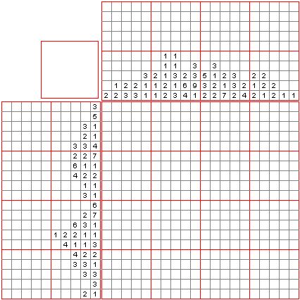 De getallen boven en links geven aan hoe lang de blokken zijn en welke kleur ze hebben. Twee blokken van dezelfde kleur moeten altijd door minstens één witte pixel gescheiden zijn. Blokken van verschillende kleuren kunnen direct aan elkaar grenzen.