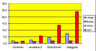 De verwerkte dekstenen zijn zelden zwaarder dan 20 ton. In de andere gebieden waar megalithische bouwwerken voorkomen kunnen de dekstenen soms een gewicht van 100 ton hebben (bijvoorbeeld de Brownshill-dolmen in County Carlow in Ierland). De omtrek van de kamers is vrijwel nooit een vierkant, vaak eerder ovaal, polygonaal, rechthoekig of in de vorm van een ruit of trapezium.
