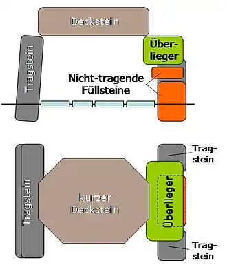 In Liepen (Mecklenburg) en op enkele andere plaatsen is het, daar waar de "überlieger" een halve meter uitsteken, meerlagig. De grotere blokken die boven in het tussenmetselwerk liggen, worden "überlieger" genoemd. Deels uit meerdere lagen bestaat ook de muuropbouw van een oerdolmen in Neu-Gaarz, waar de "unterlieger" niet van invloed is op de hoogte.