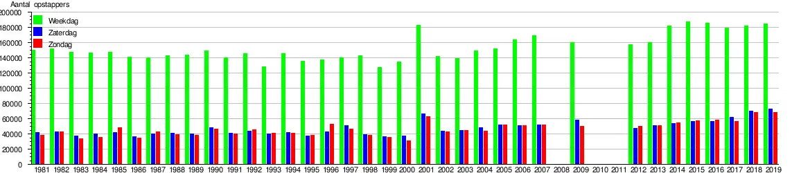 De grafiek en tabel geven het gemiddeld aantal instappende reizigers weer op een week-, zater- en zondag.[17][18]