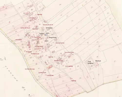 Het dorp kreeg net als Zuidlaren een hovenstructuur met rechthoekige blokken met afgeronde hoeken; een dorpsuitleg op basis van een ladderpatroon van driften en paden die ook wel Karolingische blokverkaveling wordt genoemd.[47] Een dergelijke structuur ontstond vaak bij een stelsel van kruisende wegen. In elk van deze blokken stonden een of meerdere boerderijen. Net als in Haren en Onnen zijn de percelen met de naam 'Olde hof' die ook voorkomen in Noordlaren, waarschijnlijk de oudste boerderijplaatsen of hofsteden van het dorp.[16] De acentrische plaatsing van de kerk aan zuidoostzijde van het dorp wijst er volgens Groenendijk op dat de oudste boerderijen van Noordlaren direct ten westen van kerk werden gebouwd.[39] Volgens Luning zijn echter de eerste boerderijen aan noordzijde van de kerk aan de hoge zijde van de Lageweg gebouwd.[48] In elk geval is vermoedelijk het blok tussen de Kerkstraat, Achter de Hoven (vroeger ook wel 'Kerkdwarsstraat' genoemd)[49], De Steeg en de Lageweg het oudste deel van het dorp, waarbij de Lageweg een latere verbinding vormt tussen de beide brinken.[44]