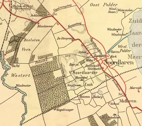 - De westelijke route langs Noordlaren was de (hoge) Hereweg of Oude Coevorderweg (nu Zuidlaarderweg) vanaf Blankeweer (vanaf de Hoge Hereweg) over de Noordlaarder es langs Noordlaren in de richting van Zuidlaren. De inwoners van Noordlaren werden door de stad Groningen verplicht om bij te dragen in het onderhoud van deze weg. Bijvoorbeeld in 1701, toen werd aangegeven dat de 'Northlaerders' net als andere dorpen hun 'district' van de toen 'onduchtlich' onderhouden weg in goede staat dienden te houden. Wanneer zij dit niet zouden doen dan zou de ambtman van Selwerd de opdracht krijgen om de weg te herstellen op 'dobbelde' kosten van de dorpen. Tussen 1727 en 1730 werd deze weg aanmerkelijk verbeterd.[10] In 1848 werd de weg verhard en kwam er ter bekostiging een tol op de hoek van de Vogelzangsteeg en over de grens met Drenthe. De verharding van de weg leidde tot de bouw van veel villa's aan en rond de weg. De tolheffing ging door tot in de 20e eeuw. De laatste tol werd pas in 1940 opgeheven. Na jaren van discussie werd in 1983 aan beide zijden van de weg ook een fietspad aangelegd.