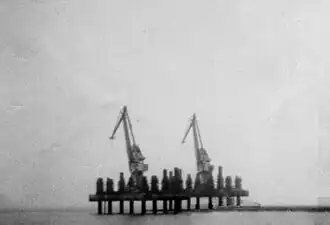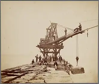 De havenhoofden werden gebouwd met betonblokken met een gewicht tussen 10 en 20 ton en geplaatst met (houten) Titan kranen die hiervoor ter plekke zijn gebouwd. De Titan voor het zuiderhoofd had een sprei van 17 meter. De Engelse ingenieur Darton Hutton was hiervoor verantwoordelijk.[10] Deze kraan kostte destijds £ 1500. De kraan had 1840 werkbare uren in een jaar en kon per jaar 25.000 m³ betonblokken plaatsen. Bij het werk aan het noorderhoofd zijn twee Titans verloren gegaan door storm. Alles bij elkaar was de productiesnelheid bij het noorderhoofd slechts de helft van die bij het zuiderhoofd.