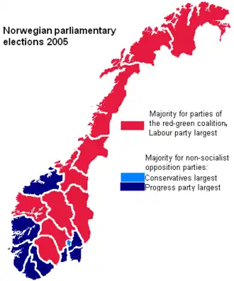 - De Rood-Groene coalitie werd de winnaar van de verkiezingen en vormde een meerderheidsregering onder leiding van Jens Stoltenberg. De nieuwe regering werd op 17 oktober 2005 geïnstalleerd, nadat de begroting voor 2006 door de oude regering was voorgesteld.