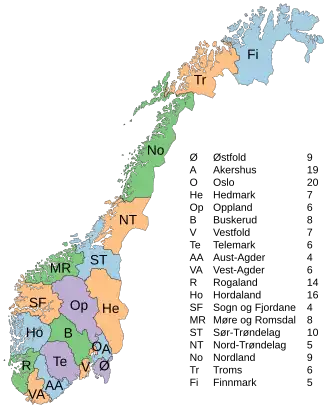 De Noorse Grondwet schrijft voor dat het land verdeeld is in 19 kiesdistricten. Dat aantal kwam tot 2017 overeen met het aantal fylker. Sindsdien zijn meerdere fylker gefuseerd. Om aan de Grondwet te kunnen voldoen blijven de oude provincies bestaan als kiesdistrict. Het aantal zetels in de districten is in 2020 opnieuw vastgesteld om rekening te houden met de wijzigingen in de bevolking van de districten. Het aantal zetels per district wordt bepaald door het aantal inwoners én de oppervlakte van het district. Hierdoor kiezen met name de dunbevolkte districten in het noorden van het land meer kandidaten dan op basis van alleen het aantal inwoners reëel zou zijn. Finnmark, qua oppervlak het grootste fylke, qua bevolking het kleinste, kiest daarom 5 leden waar het op basis van de bevolkingsomvang slechts 2 zou mogen kiezen.