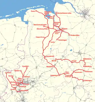Sinds 5 november 2000 exploiteert de NordWestBahn in opdracht van de Landesnahverkehrsgesellschaft Niedersachsen (LNVG) het Weser-Ems-Netz in Nedersaksen. De concessie werd in 2014 tot 2026 verlegd.[3]