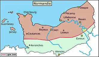 Het Normandisch wordt in een noordelijk en zuidelijk deel gesplitst door de isoglosse Ligne Joret. Deze markeert het verschil tussen tchièn ("hond") in het noorden en kièn in het zuiden.