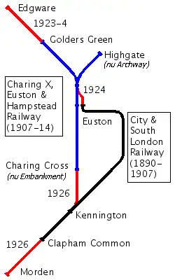 Op 22 juni 1907 werd de Charing Cross, Euston & Hampstead Railway (CCE&HR) (ook Hampstead Tube genoemd) in gebruik genomen. De lijn liep van station Strand (nu Charing Cross) naar Camden Town, waar hij zich splitste in een tak naar Golders Green en een tak naar Highgate (nu Archway). Op 6 april 1914 werd de CCE&HR in het zuiden met één station verlengd naar Embankment (toen nog Charing Cross geheten), waar op de District line kon worden overgestapt.