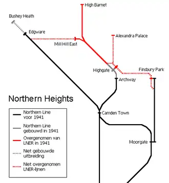 In juni 1935 kwam het Londense vervoerbedrijf met een ambitieus uitbreidingsplan voor de Northern line. Het behelste de integratie in het metronet van een bestaande spoorlijn van de London and North Eastern Railway (LNER) over de Northern Heights. Deze lijn uit de jaren 1860-1870 liep van Finsbury Park via Highgate naar Edgware, met takken naar Alexandra Palace en High Barnet, en werd bereden door stoomtreinen. Na elektrificatie zou de lijn op drie punten met de Northern line verbonden worden: tussen de Northern City line en het bovengrondse station Finsbury Park, tussen Highgate en East Finchley door een diepe tunnel en met een kleine omlegging van het spoor nabij station Edgware. Daarnaast zou de lijn naar het noorden verlengd worden tot Bushey Heath.