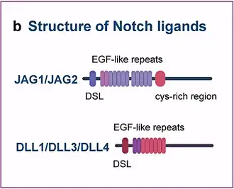 Notch-signalering wordt geactiveerd via direct cel-tot-celcontact, gemedieerd door interacties tussen het Notch-receptoreiwit in de signaalontvangende cel en een ligand in een aangrenzende signaaldoorgevende cel. Deze type 1 single-pass transmembraaneiwitten vallen in de Delta/Serrate/Lag-2 (DSL)-familie van eiwitten, die is vernoemd naar de drie canonieke Notch-liganden.[17] Delta en Serrate worden aangetroffen in Drosophila melanogaster, terwijl Lag-2 wordt aangetroffen in Caenorhabditis elegans. Mensen bevatten 3 Delta-homologen, Delta-achtige 1, 3 en 4, evenals twee Serrate-homologen, Jagged 1 en 2. Notch-eiwitten bestaan uit een relatief kort intracellulair domein en een groot extracellulair domein met een of meer EGF-motieven en een N-terminus DSL-bindend motief. EGF-herhalingen 11-12 op het extracellulaire Notch-domein zijn noodzakelijk en voldoende gebleken voor trans-signaleringsinteracties tussen Notch en zijn liganden.[18] Bovendien zijn EGF-herhalingen 24-29 betrokken bij de remming van cis-interacties tussen Notch en liganden die in dezelfde cel worden samen tot expressie gebracht.[19]