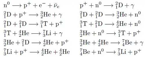 De meest voorkomende kernreacties voor de vorming van de lichte elementen in het heelal staan in de grafiek daarvoor. Linksboven vervalt een neutron tot een proton , een elektron en een elektron-antineutrino. Rechtsboven vormen een proton en een neutron samen een deuteron , zware waterstof, waarbij gammastraling vrijkomt. Op de tweede regel ontmoet dit deuteron een proton om samen helium te vormen...enzovoorts, totdat rechtsonder lithium is gevormd.
