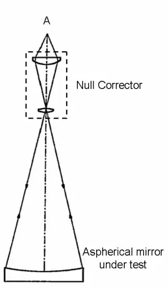 De nulcorrector compenseert het asferische aandeel van de spiegelvorm, zodanig dat de combinatie er vanuit punt A in de tweede afbeelding precies sferisch uitziet indien de te testen spiegel de juiste vorm heeft.