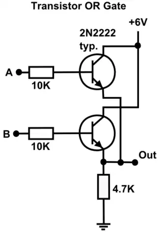In een transistor-schakelcircuit (zonder relais, bijvoorbeeld een IC) wordt een OF-poort altijd opgebouwd met een NAND-schakeling als basis. Hier worden dan nog eens twee inverters voor de ingangen gezet, waardoor er een OR-werking ontstaat. Hiervoor zijn dus altijd minimaal vier transistors nodig.