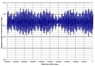 De hellingshoek is niet constant maar varieert met een periode van ongeveer 41.000 jaar. Het laatste maximum viel 10.700 jaar geleden en bedroeg 24,4°, het volgende minimum zal over 9.800 jaar vallen en uitkomen op ongeveer 22,6°. Over de afgelopen 5 miljoen jaar schommelde de hoek tussen ongeveer 24,5° en 22,0°.