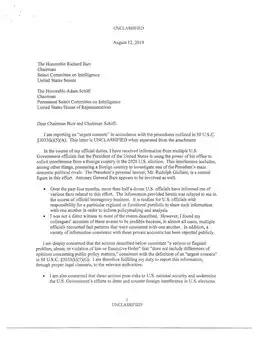 - In het kader van mijn officiële verplichtingen heb ik van verschillende federale ambtenaren de informatie ontvangen dat de president van de Verenigde Staten zijn macht gebruikt om een buitenlandse natie om inmenging te vragen in de presidentsverkiezingen van 2020. Deze inmenging omvat onder andere het aanzetten van een buitenlandse natie om een onderzoek te voeren naar de belangrijkste binnenlandse politieke rivalen van de president.[14]