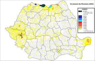 In Roemenië wonen 51.703 Oekraïners volgens de volkstelling van 2011 (0,3% van de bevolking). Ze vormen in 12 gemeenten echter een meerderheid van de bevolking: Bistra, Bocicoiu Mare, Poienile de sub Munte, Remeți, Repedea, Rona de Sus, Ruscova, Bălcăuți, Izvoarele Sucevei, Ulma, Știuca en Copăcele.