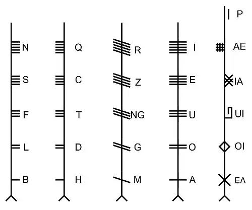De letters van het ogham-schrift heten naar bomen die steeds met een andere letter beginnen. Men zegt dus niet "aa, bee, see, dee" maar "ailm, beith, coll, dair". Ook de Latijnse letters droegen voorheen in het Iers deze namen, maar tegenwoordig benoemt men de letters als in het Engels, behalve de A, die wordt genoemd zoals hij wordt uitgesproken.
