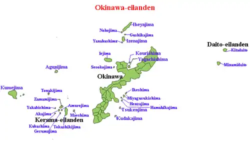 - Okinawa (沖縄本島, -hontō) en de nabijgelegen eilanden: