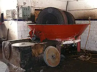 De olijven worden verwarmd en langzaam tot pasta vermalen.