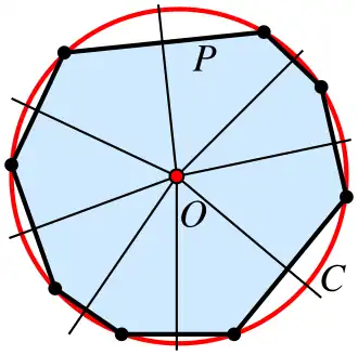 Omgeschreven cirkel C van een cyclische veelhoek P