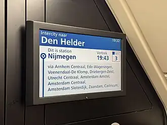 - Beeldschermen in de rijtuigen, waarop actuele reisinformatie (vertrektijden, overstapmogelijkheden, verstoringen, werkzaamheden) wordt getoond;