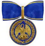 Het versiersel wordt aan een blauw lint met gouden boorden gedragen. Het modelversiersel heeft een diameter van 32 millimeter, voor dagelijks gebruik is een miniatuur van 16 millimeter bijgevoegd.