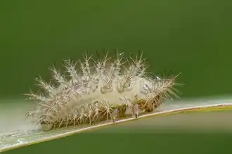 De larve bereikt een lengte van ongeveer vijf millimeter. Het lichaam is wit en wormachtig en enigszins gedrongen. Op de bovenzijde zitten rijen vlezige uitsteeksels die een krans van kleine haartjes dragen.