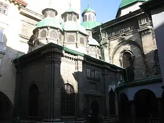 - De in het jaar 1631 ingewijde Ontslapeniskerk werd in de stijl van de Italiaanse renaissance ontworpen en gebouwd door Paweł Rzymianin, Wojciech Kapinos en (vanaf 1598) Ambroży Przychylny. De muren worden verdeeld door pilasters, rondbogen en reliëfs en het gebouw heeft drie koepels met daarop lantaarns. Het interieur is ingericht met schilderijen uit de 17e en 18e eeuw en een iconostase van 1773. De glas-in-loodramen dateren uit de periode 1920-1930 en werden gemaakt door de impressionistische schilder Petro Ivanovitsj Kholodnyj. De reliëfs zijn het werk van de meesters van Lemberg: Constantijn en Jacob Koeltsjik.