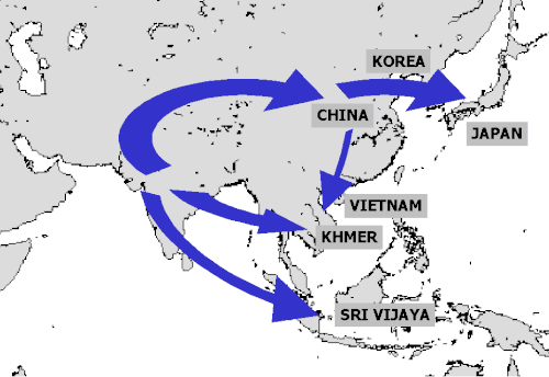 Na enkele eeuwen werd het mahayanaboeddhisme de meest populaire stroming in India. Het verspreidde zich via het noorden naar Centraal-Azië, China, Korea en bereikte ten slotte Japan in 538 n.Chr. Via het zuiden ging het via de Indische zee naar Zuidoost-Azië waar het in door het Sri Vijaya-rijk en het Khmer-rijk geaccepteerd werd.