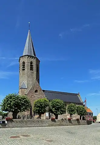 Reeds in 961 zou er een parochie zijn. In 1193 is er een schriftelijke vermelding van deze parochie. In de 13e eeuw werd een bakstenen kruiskerk in vroeggotische stijl gebouwd. De kerk had een vieringtoren. Muurwerk van de vieringtoren bevat nog veldstenen, wat wijst op een romaans kerkgebouw dat aan de gotische kerk voorafging. Pas in 1520 werd de toren voltooid. In de jaren '70 van de 16e eeuw werd de kerk door de Geuzen vernield. De westelijke helft van de kerk werd daarop niet meer hersteld, maar in 1580 gesloopt. De vieringtoren werd daarmee tot westtoren. Tussen 1640 en 1643 werden de zijbeuken herbouwd en in 1644 werd het koor naar het oosten verlengd en werd ook de toren hersteld. In 1926 werd de kerk nog gerestaureerd onder architectuur van Alphonse De Pauw.