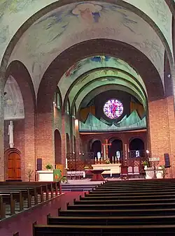 De beschilderingen op de gewelven met onder meer Bijbelse taferelen werden in de bouwfase aangebracht door pater augustijn Leo Coppens. Ook de kruisweg werd in 1954-1955 door hem geschilderd. Het geheel van de gewelfbeschildering is één beweging vanuit de vier zijden van de kerk naar het centrale gewelf: het hemelse Jeruzalem met de kroning van Maria. Het schip van de kerk beeldt, vanaf de ingang, het Gebed des Heren uit. Boven het priesterkoor wordt het leven van Maria weergegeven. De linker dwarsbeuk vormt de Onze-Lieve-Vrouwkapel. De rechter dwarsbeuk vormt de Sacramentskapel, waar het grote gewelf verwijst naar de parabel van de Goede Herder en naar het Laatste Avondmaal.