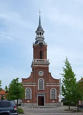 Het betreft een gebouw in eclectische stijl, met neoclassicistische en neobarokke stijlelementen. De westgevel heeft een door twee korte zijbeuken geflankeerde ingebouwde toren. Het schip is eenbeukig. De neobarokke toren heeft een vierkante benedengeleding en een achtkante klokkengeleding met daarboven een koepeldak en een lantaarn met spits.