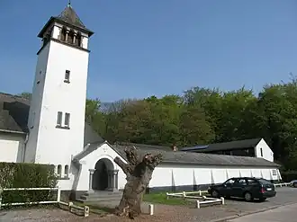 Het betreft een witgeschilderd gebouwencomplex met een kapel en daaraan vastgebouwd een L-vormig klooster. Via een rondboogportaal betreedt men het complex met links de kapel welke een vierkante toren bezit. De glaswand met blauwige glazen werd vervaardigd door Frans Crickx en Ovide Piron.