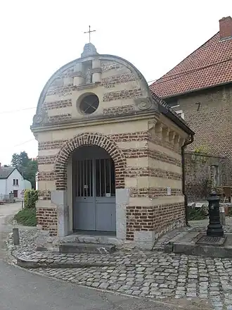 Het merkwaardig kapelletje is gebouwd in een min of meer naïeve barokstijl, in baksteen met mergelstenen speklagen. De kapel wordt betreden door een rondbogige toegangsdeur. De topgevel is eveneens rondbogig. Ze bevat een nisje met Mariabeeld en de tekst: Virgina Maria (Maagd Maria).